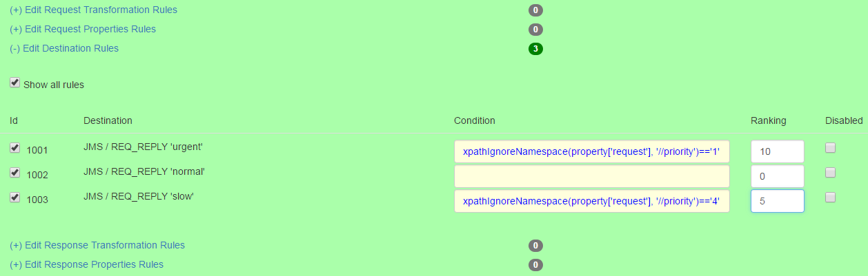 Click on "Edit Destination Rules" link and then select "Show all rules" checkbox. This should unhide 3 destinations created in the step 1. Select 3 JMS destinations and type data as on picture below: "Condition" for rule 1 : xpathIgnoreNamespace(property['request'], '//priority')=='1', "Ranking" for rule 1 : 10, "Condition" for rule 3 : xpathIgnoreNamespace(property['request'], '//priority')=='4', "Ranking" for rule 3 : 5